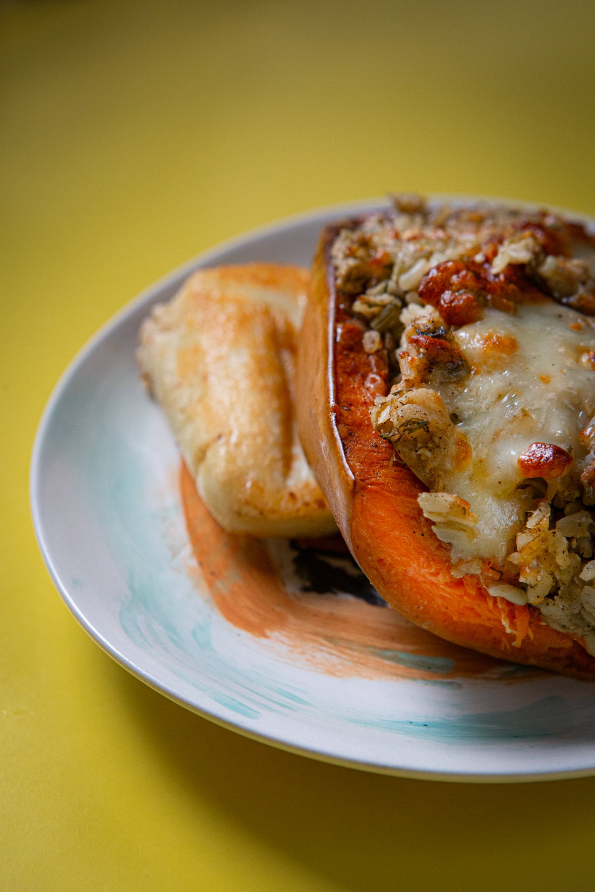 a sütőtököket csónak formába vágjuk, majd szépen puhára elősütjük, és LAPOSAN ráhelyezünk bryndzás tejfölös kapros paprikakockás barnarizst – igazi hagyományos, a juhtúró miatt sós de a sütőtök és kapor miatt édeskés isteni finomságot készítünk! allergének: 07, 09