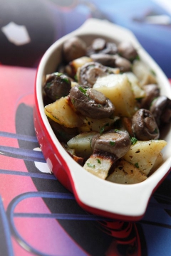 a közkedvelt brassói aprópecsenye vegetáriánus változata, ki hinné, de hús helyett lecsós gombával párosítjuk a tepsiskrumplit. mirelit hasáb nuku, héjában tepsis burgonya. semmi menzakoszt.
