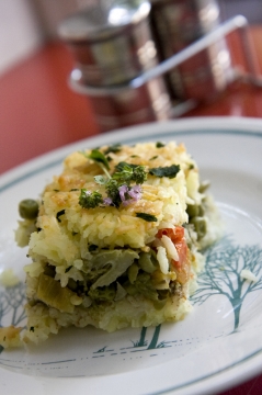 egyik első indiai ételünk – most már barnarizs finom párolt zöldségekkel, joghurttal rakva és sütve. igazi indiai fűszerezéssel, és most az örök csodálatos sütőben sült köleses mogyorósültünkkel!!!